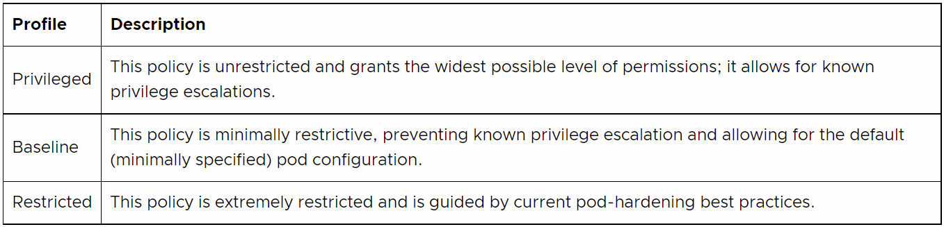 这些级别在 Kubernetes 的 Pod 安全标准中有详细描述,但下面是 Kubernetes 自己的文档的摘要: