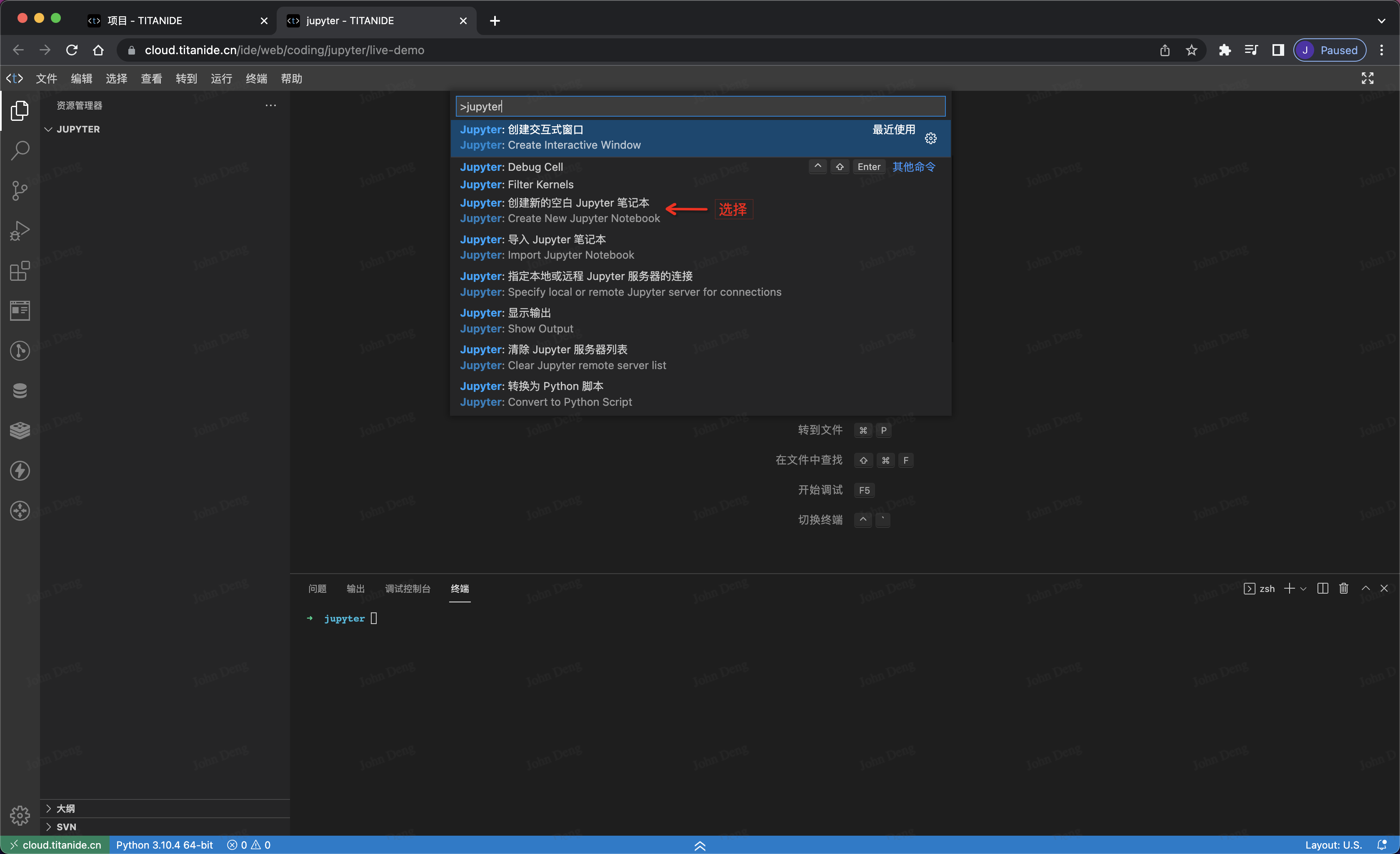 Mac 用户通过快捷键 Command + Shift + P 打开命令操作面板;Windows 用户通过快捷键 Ctrl + Shift + P 打开命令操作面板。创建新的 Jupyter Notebook。