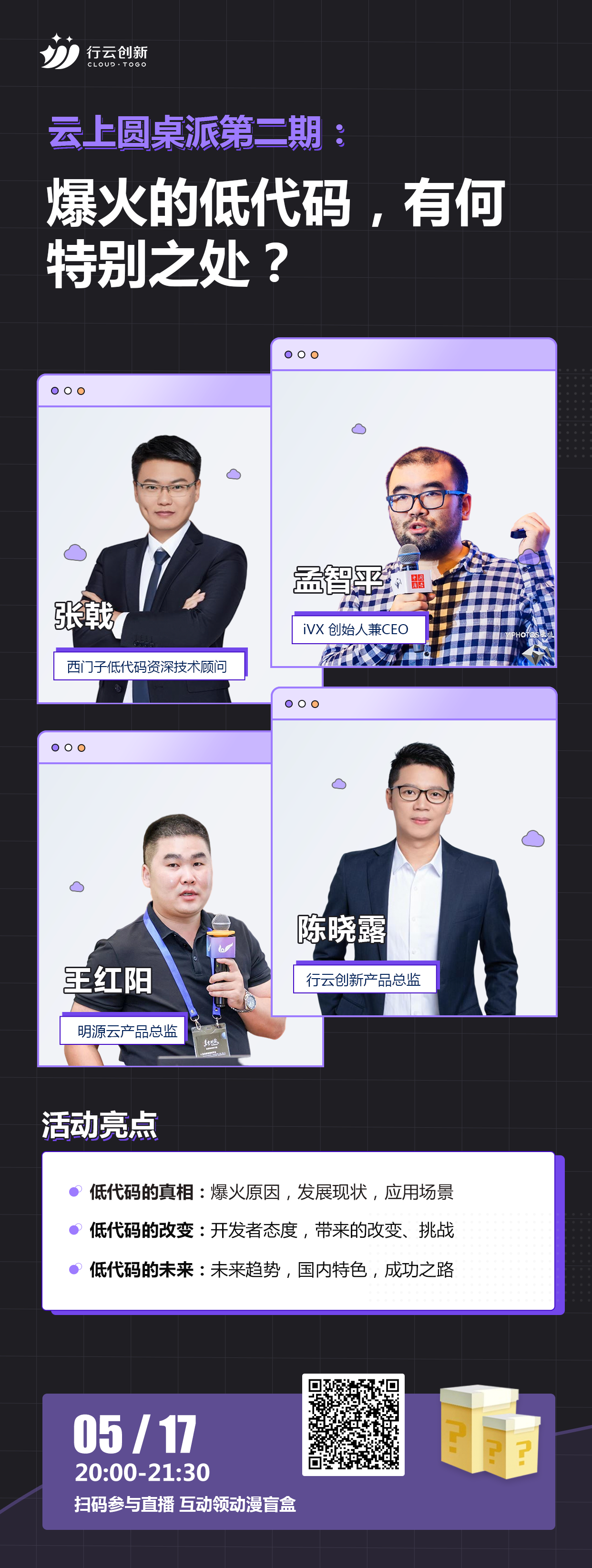 5月17日20:00《云上圆桌派第二期:爆火的低代码,有何特别之处》直播来啦!活动邀请西门子工业软件西门子低代码资深技术顾问张戟,iVX 创始人兼CEO孟智平,明源云产品总监王红阳,乐鱼创新产品总监陈晓露四位大咖和乐鱼创新CEO马洪喜一起对低代码爆火背后的原因、开发者对低代码的态度、低代码带来的变化和应用场景等多个话题展开讨论。