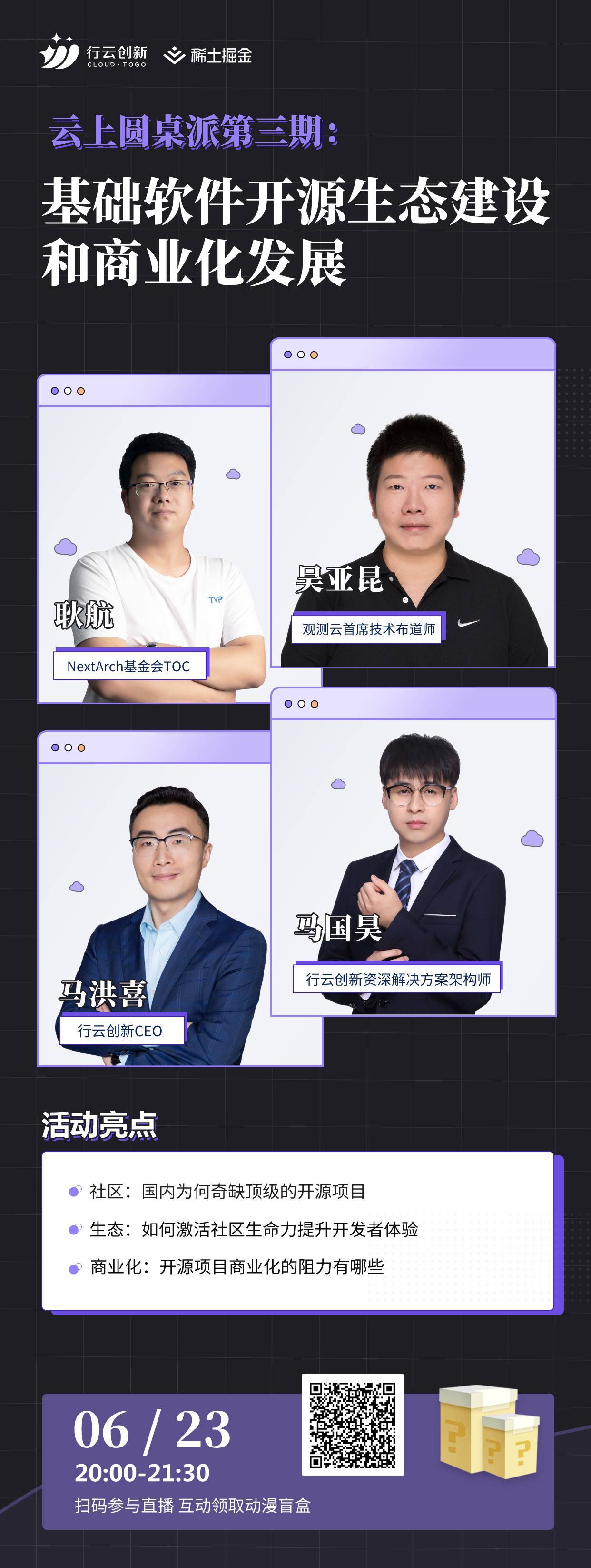 6月23日晚上20:00,云上圆桌派第三期《基础软件开源生态建设和商业化发展》即将开启,活动邀请NextArch基金会TOC耿航,观测云首席技术布道师吴亚昆,乐鱼创新资深解决方案架构师马国昊三位大咖和乐鱼创新CEO马洪喜一起对国内的开源生态现状、社区的建设及商业化发展等多个问题一起展开讨论。